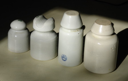 From left to right: tempered glass insulators introduced in the late 1920s to 1950s for high frequency three- and twelve-channel high frequency carrier. Last insulator on right superceeded previous designs and was meant for 16-channel carrier (1955).