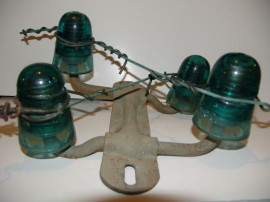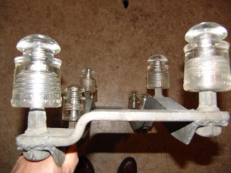 Case span and crossarm-mounted specialty insulators for the point-type bracket. Glass on left and fiberglass spool on right.