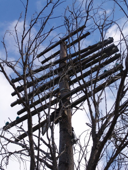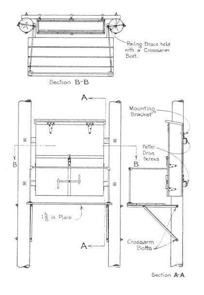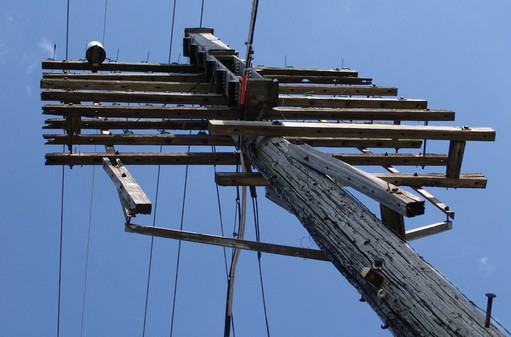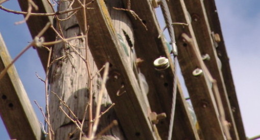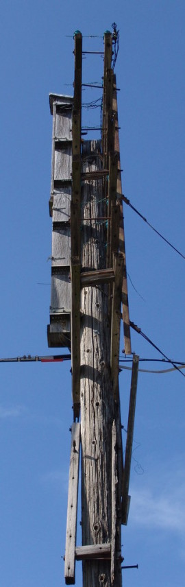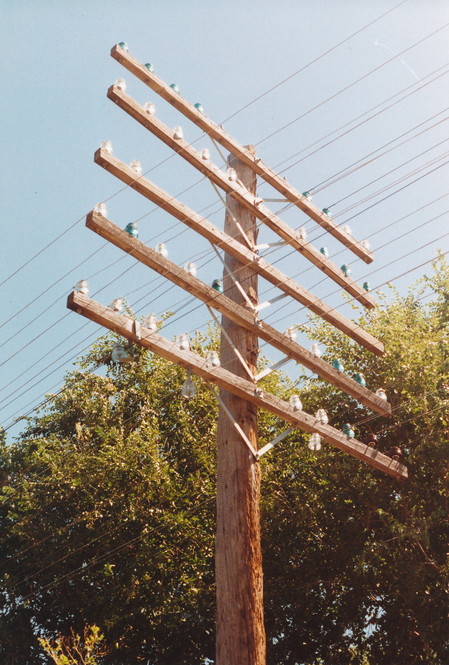 The railroads were not afraid to try unique solutions to old fashioned problems. Here we have a modified “A” structure for open wire signal systems. Note the support features and the lack of an “X” brace. Properly applied steel braces (30″) are sufficient (with the pole’s cantilevered design), and arms, to afford a strong and resilient structure.