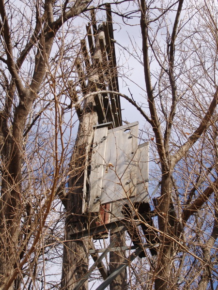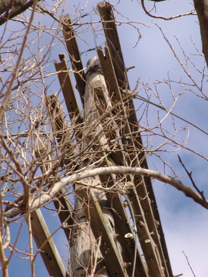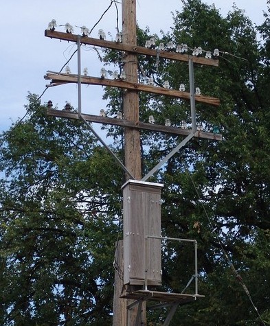 Here illustrated, is one of the few vertical distributing box installations left in the Topeka, Kansas area in a state of partial deterioration. The stout cable with the red marker is a fiber CATV system link and Cox is using this old Missouri Pacific Railroad pole as a support. The vertical boxes were made from various woods, and the knob-and-cleat house-wiring insulators were also employed.
