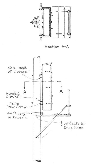 Chicago-Northwestern Railroad Company’s H-Fixture equipped with double arms and terminal. Note insulated drive rings of white porcelain for bridling connectors to open wire pairs.