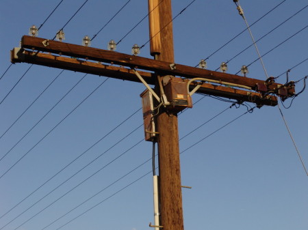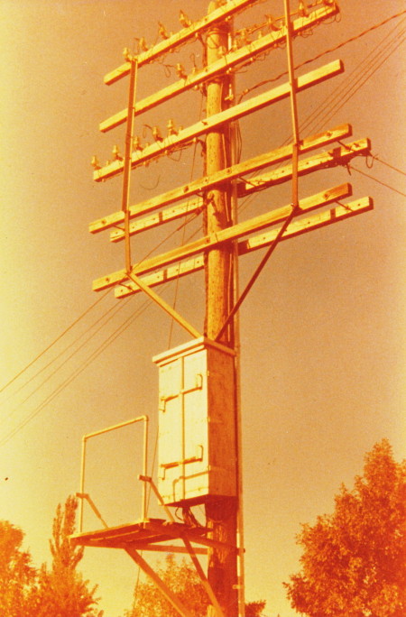 Location in northeast Kansas where ARA distributing boxes acted as buried cable junctions to open wire, c. mid-1920s. Note the canister at top arm left. It was a carrier filter.