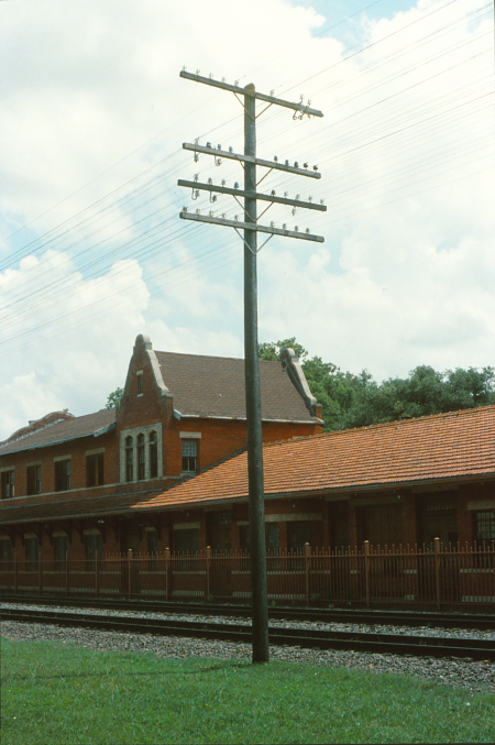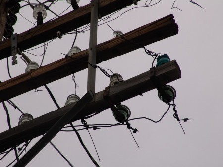 Note the unique use of split knob porcelains, so common in residential construction of the period and known as part of the “knob and tube” indoor wiring system. Unfortunately, these only offered space for one pair of bridle wires.
