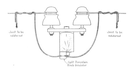 Method of using double arming dead end shackles on aerial wire c. 1923.
