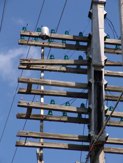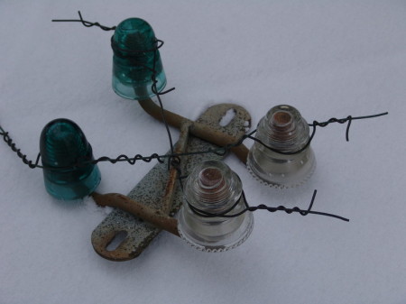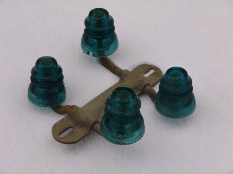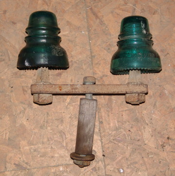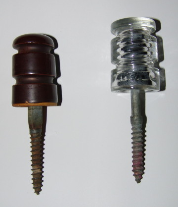Under crossarm and depot station bridling run insulators. Macomb-Illinois Porcelain (1940s) left and Hemingray (1950s) clear glass on right.