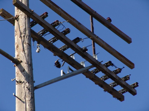 5-kV heavy dead-end shackles for UPRR 2.4-kV Delta Centralized Track Control circuits. Note double-deadends for insertion of disconnect switch blades mounted on standard cutout holder. ANSI gray spools denote installation after 1966.