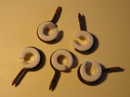 Many railroads used the insulated screw-in wire holders with porcelain inserts which were large enough to offer numerous bridle wires space when staggered about 8″ to one foot apart at the bottom of the arm. One is pictured below:
