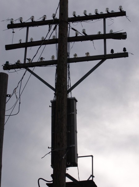Towering ruin distinctly illustrates use of Aerial Distributing Boxes for 3 arm and larger poles, c. 1925.
