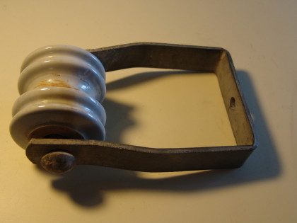 Detail of insulated over-arm glass spool shackle. Hemingray insulator spool, c. 1956.