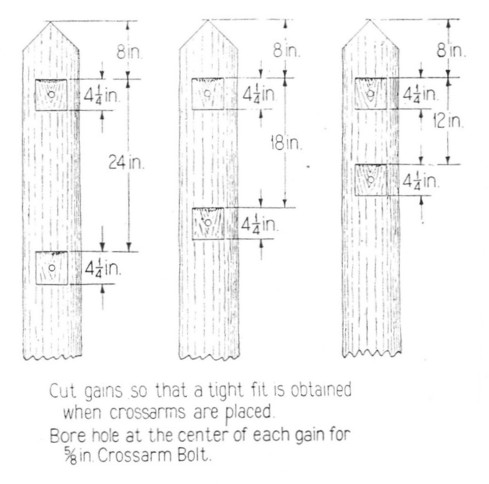 Typical Chicago Northwestern Railway specification 10′ crossarm. Construction after the mid-1950s favored Continental Rubber Works Pony and SEECO DP insulators. Note the 10B arm modified to accept carrier: pins number 1-2, 3-4, 7-8, 9-10. CNW design.