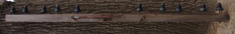 Typical Chicago Northwestern 10B arm sporting Cont. Rubber Works narrow profile insulators. These insulators directly screwed on non-cobbed bare steel pins as thimbles were 1/2″ diameter.