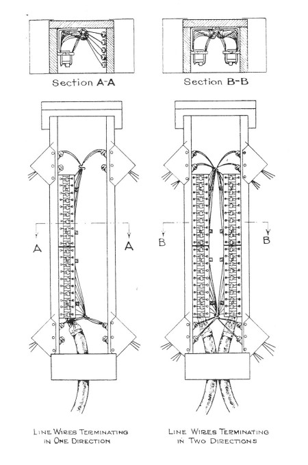 Junction between an open wire lead and a pulp multi-pair cable on H-fixture Terminal Structure. Taken from suggested specifications of the American Railway Association (now the Association of American Railroads). Circa: 1918.