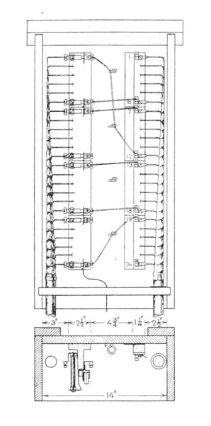 Typical medium sized terminal box for open wire and cable connections, c. 1919. Note when splicing cable, the first, lowest numbered pairs are used at the top and outside pairs used in descending order to higher numbered quads at bottom.