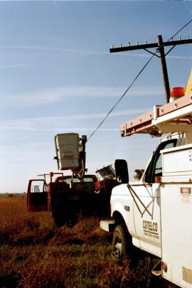 For those of you in telecommunications or have an interest in aerial wire who have not seen this 1953 classic science fiction film, “It Came From Outer Space,” prepare to be surprised.  Open wire is featured in this film and is shot quite magnificently, revealing many lengthy, detailed views from the top of a cherry picker truck ladder.  The wires are not “frogged” by the lineman when using the test phone and it is apparent considerable care was taken in scrutinizing each movie frame when aerial wire was a part of a scene.