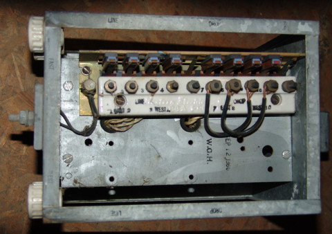 Internal view of protector for railway communications. Note white porcelain bushings on left end instead of rubber grommets.