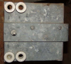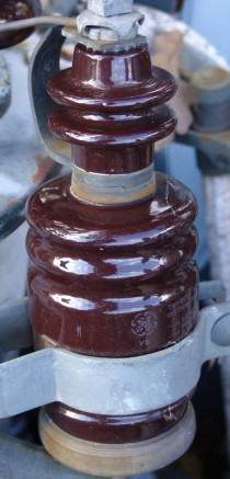 Close-up of interior of lightning protection feature under Bakelite twist cover. Note copper ground below lower porcelain hardware.