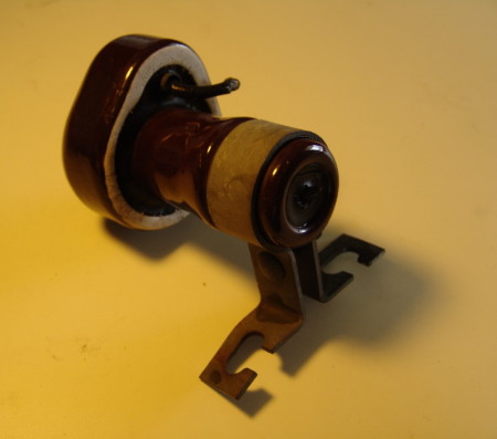 Crystal Valve Lightning Arrester for under 1,000-volt service. Note the base ground has been cut, but the lead in to the primary circuit is intact.
