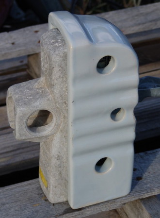 Side view of same L.M. Cutout. Holes in housing allowed it to be mounted in parallel with the crossarm by lag screws.