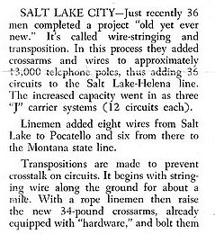 This article was originally published in the Lines West newsletter in late 1952 (don’t have the information to cite a specific date) which dedicated an article to the re-construction of the Salt Lake City, UT to Helena, MT J-Carrier Long Lines toll lead. Thank you Bob Tally for making this available to Song of the Open Wire.